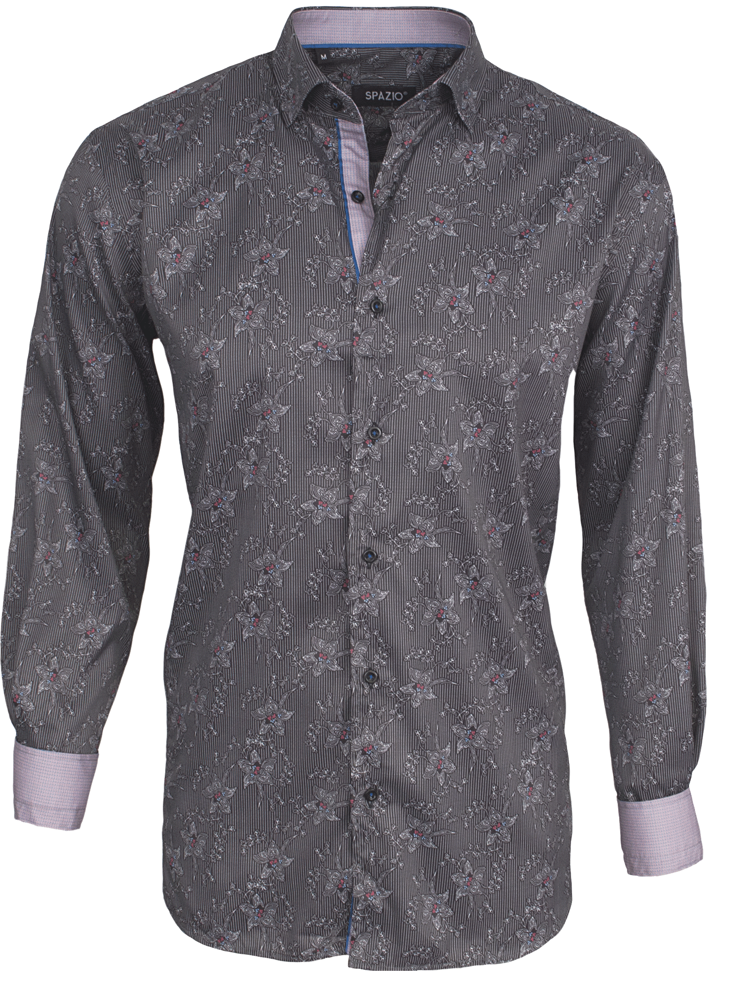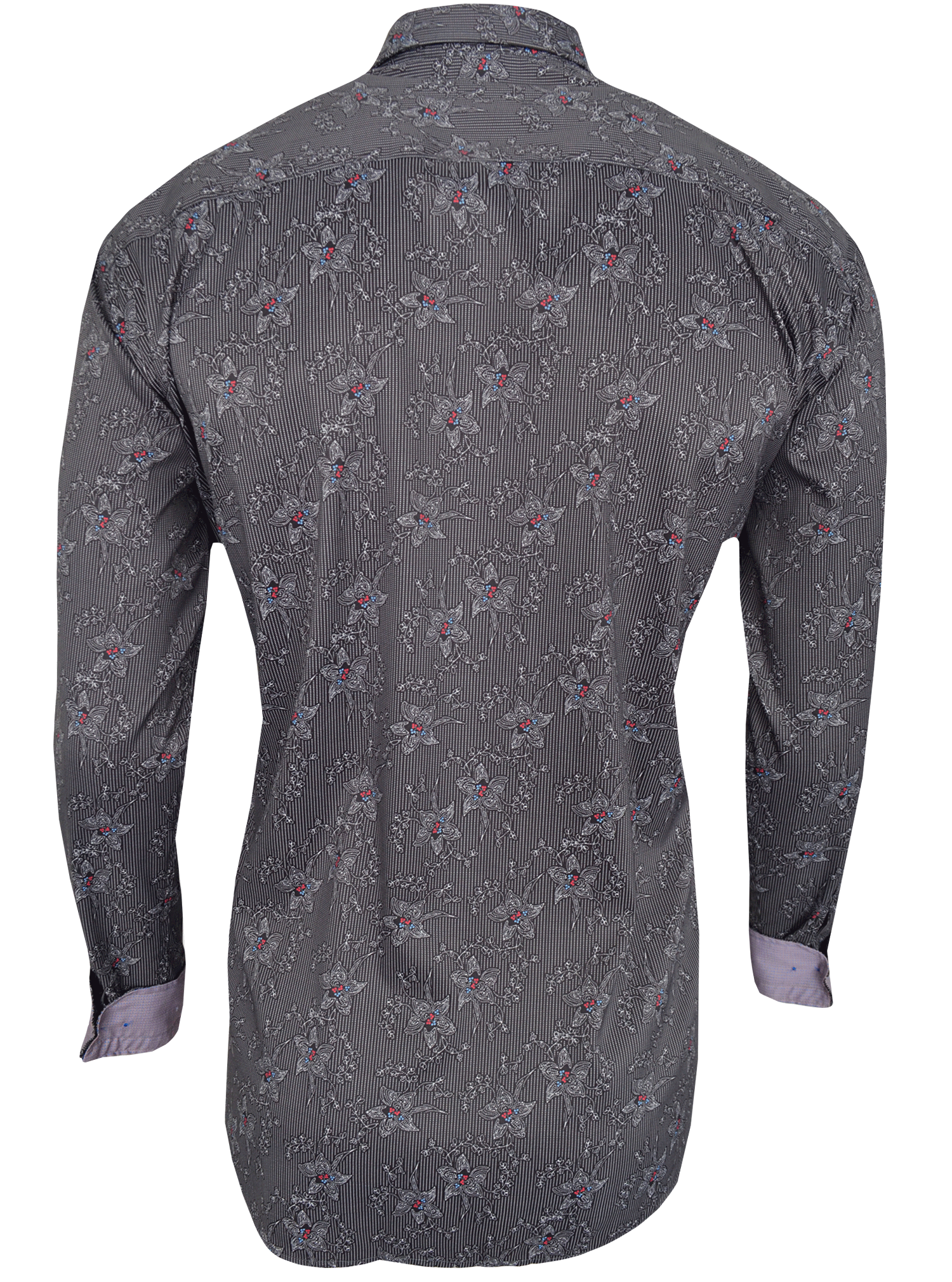 Elevate your wardrobe with the Cabriola in Black, a sophisticated shirt that balances classic restraint with refined detail. The shirt features a subtle dotted pin stripe complemented by an intricate floral pattern, where crimson accents on the blooms add warmth and visual interest. Distinctive mini square blocks in vibrant blue and orange punctuate the cuff, collar, and placket—a signature touch that transforms this piece from understated to unmistakably stylish. Perfect for the discerning man who appreciates craftsmanship and nuanced design.
