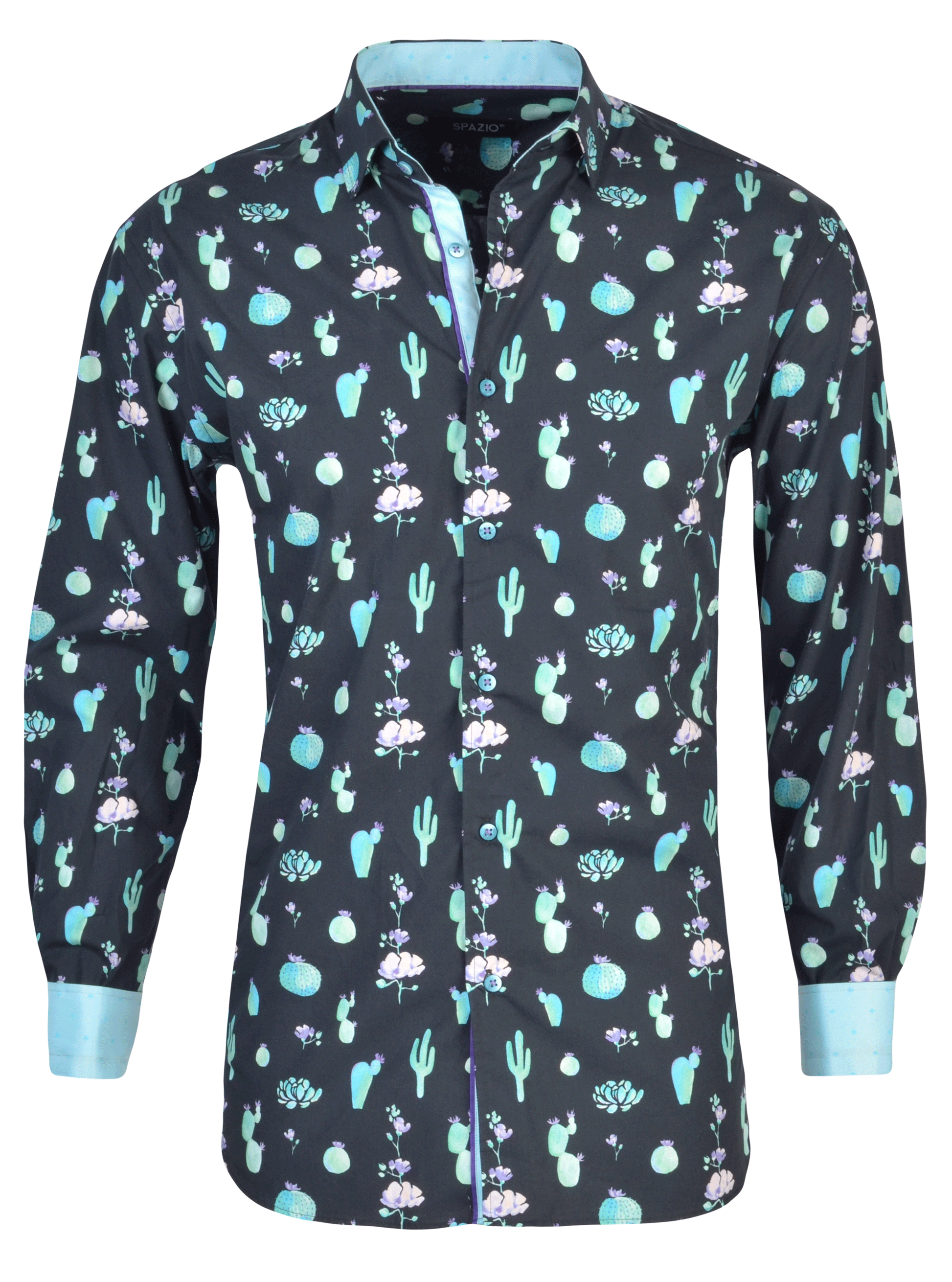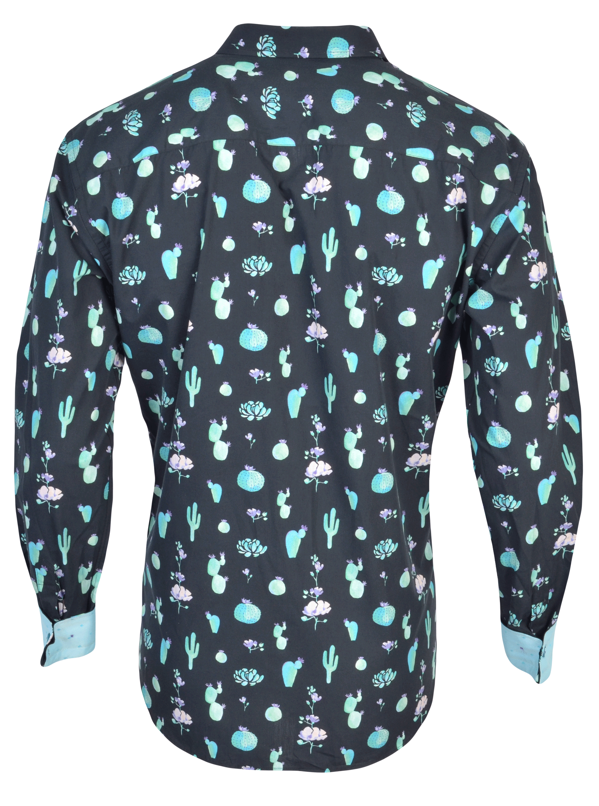 Crafted from lightweight 100% cotton, the Desert Cactus shirt exemplifies Italian style with a modern twist. Its black fabric is adorned with subtle cactus prints in aqua, green, and lilac, creating a refined yet distinctive pattern. This long sleeve button-down shirt is made to ensure timeless elegance, while aqua contrast details enhance the shirt’s sophisticated appeal. Ideal for those seeking breathable comfort combined with understated, nature-inspired style.