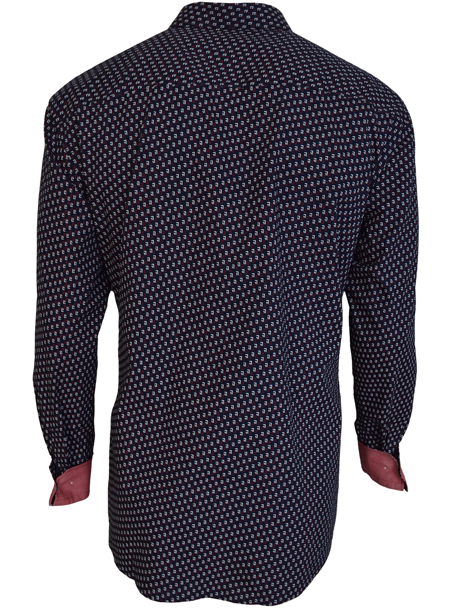 The Flinn long sleeve dress shirt features a sophisticated navy base accentuated by a subtle white and burgundy print pattern. Its distinctive burgundy contrast on the cuffs, placket, and collar adds refined detail, elevating the overall design. Perfectly paired with navy or burgundy chinos, this shirt offers versatile styling options ideal for both professional and smart-casual settings. Crafted to combine classic elegance with a modern edge, the Flinn shirt ensures you present a polished, confident look.