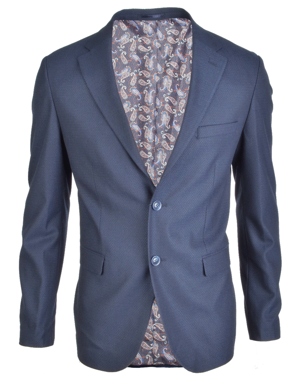 This navy blue and black sport blazer features a subtle mini geometric jacquard diamond pattern woven into the fabric. It complements navy or black trousers effortlessly. The interior showcases a striking contrast of dark navy and burnt orange, complete with a built-in pocket square detail for a refined finish.