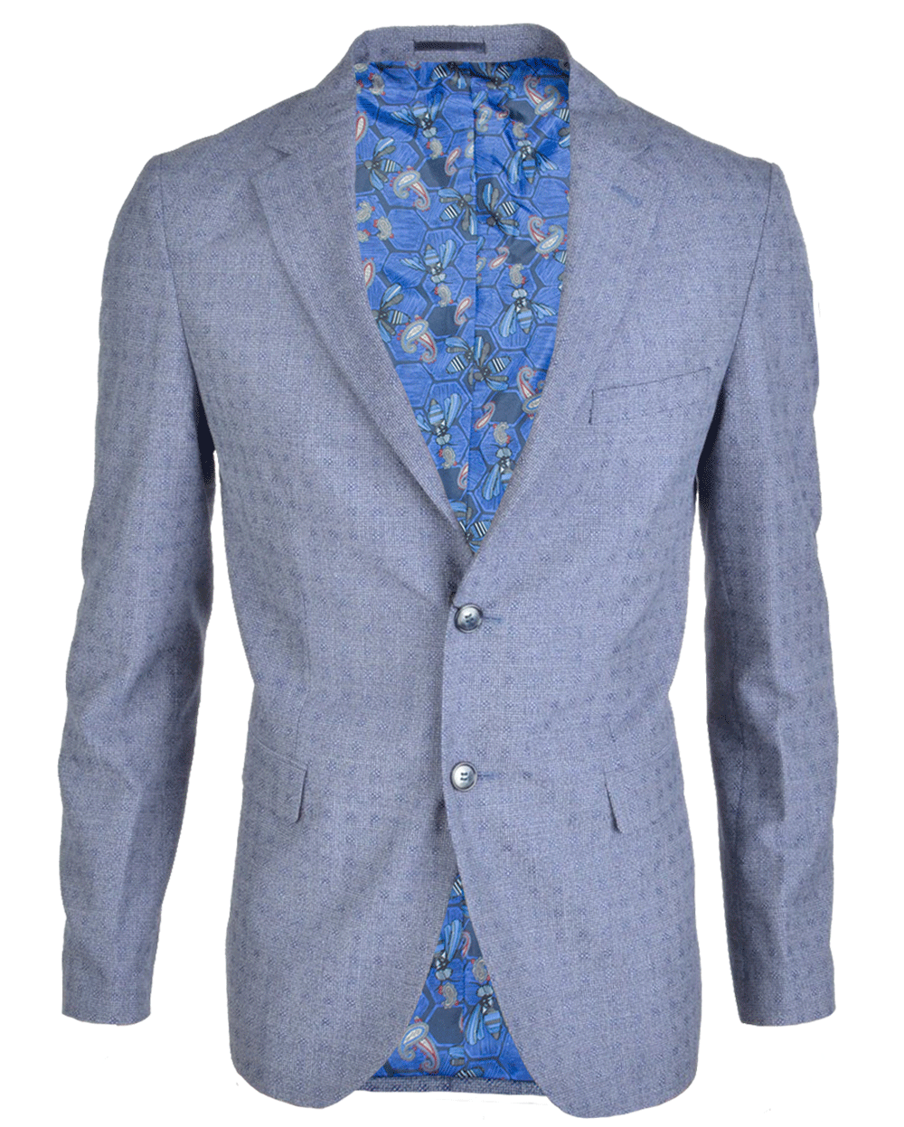 This navy blue woolen jacket features a jacquard fabric with a geometric circle pattern, combining lightweight comfort with refined texture. Its versatile design pairs effortlessly with navy or grey pants, making it an ideal choice for a polished and professional wardrobe.