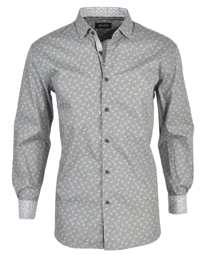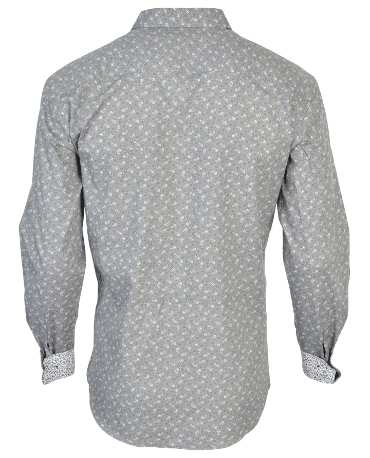 The Keim long sleeve button-down shirt features a sophisticated white paisley print on a soft grey 100% cotton fabric, ensuring comfort and breathability. Its white and black geometric accents add a modern contrast, making it a versatile piece that pairs effortlessly with black, white, or denim bottoms. Ideal for those seeking a refined yet contemporary look.