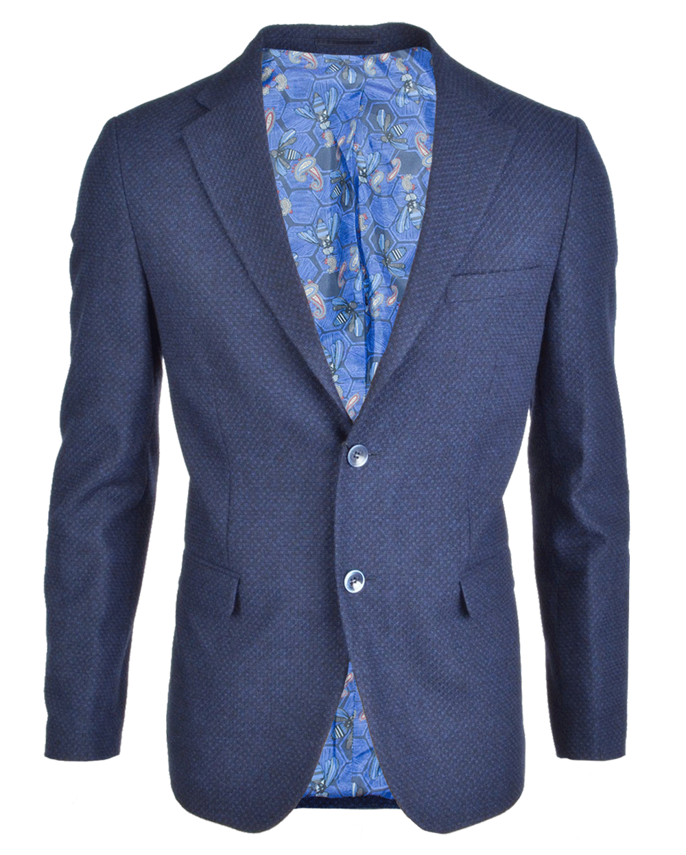Experience the Navy Peak men's sport blazer, featuring an intricate navy and black beehive jacquard fabric. This versatile piece seamlessly transitions from formal to casual, pairing effortlessly with navy or black dress pants for a polished look. For a refined yet relaxed style, dress it down with denim jeans. Expertly crafted, this blazer combines distinctive texture and classic tones to enhance your sartorial versatility.