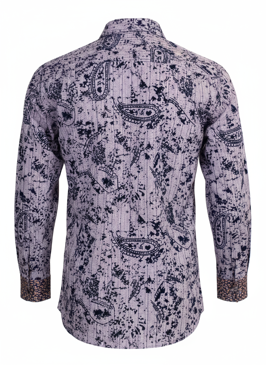 The Paisley Grote is a men’s long sleeve shirt distinguished by its textured flocking paisley pattern in rich purple and gold tones. Designed to make an impression on nights out, its vibrant color contrast adds depth and sophistication to your look. Ideal when paired with navy or light stone khaki chinos, this shirt effortlessly balances bold style with refined versatility for a polished, expert-curated ensemble.