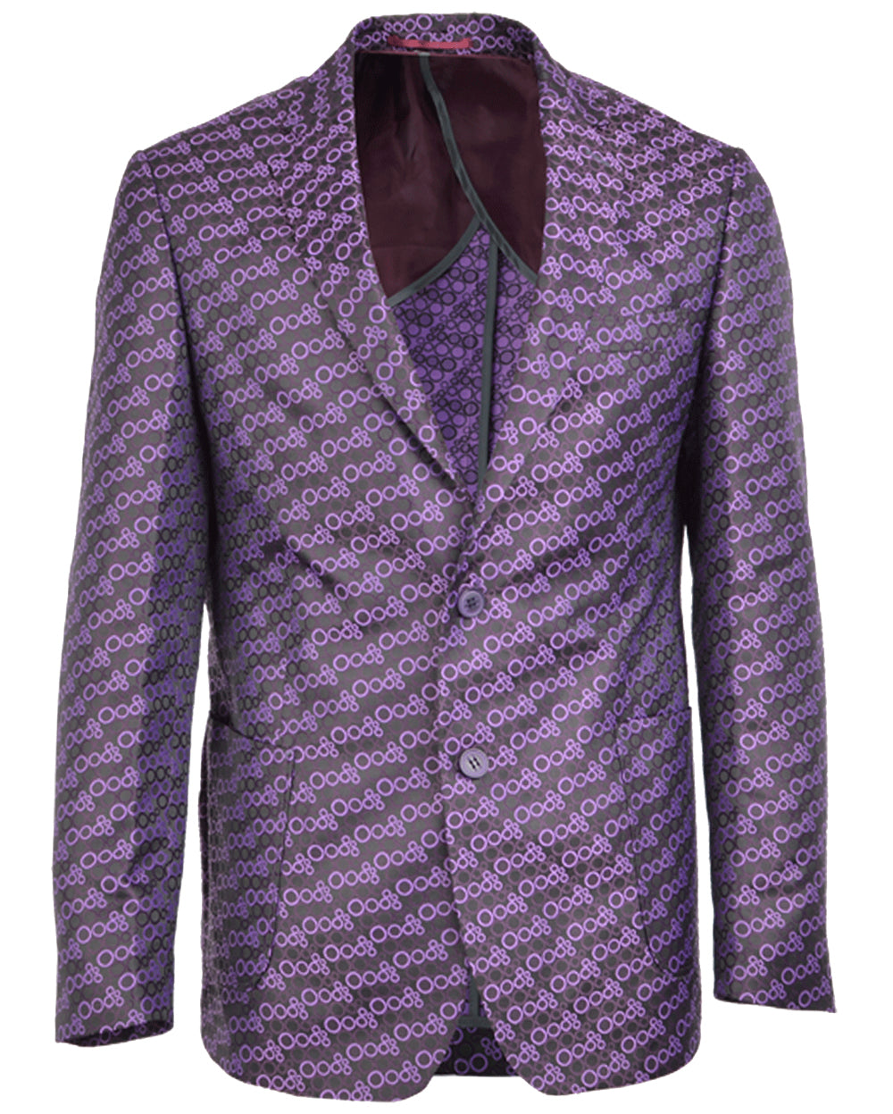 Introducing the Purple Disc blazer, a luxurious addition to your formal wardrobe. This men's suit blazer boasts a sophisticated black body with intricate purple jacquard circles, perfect for any formal or date night occasion. Elevate your style with this elegant piece, ideal for pairing with black chino pants.